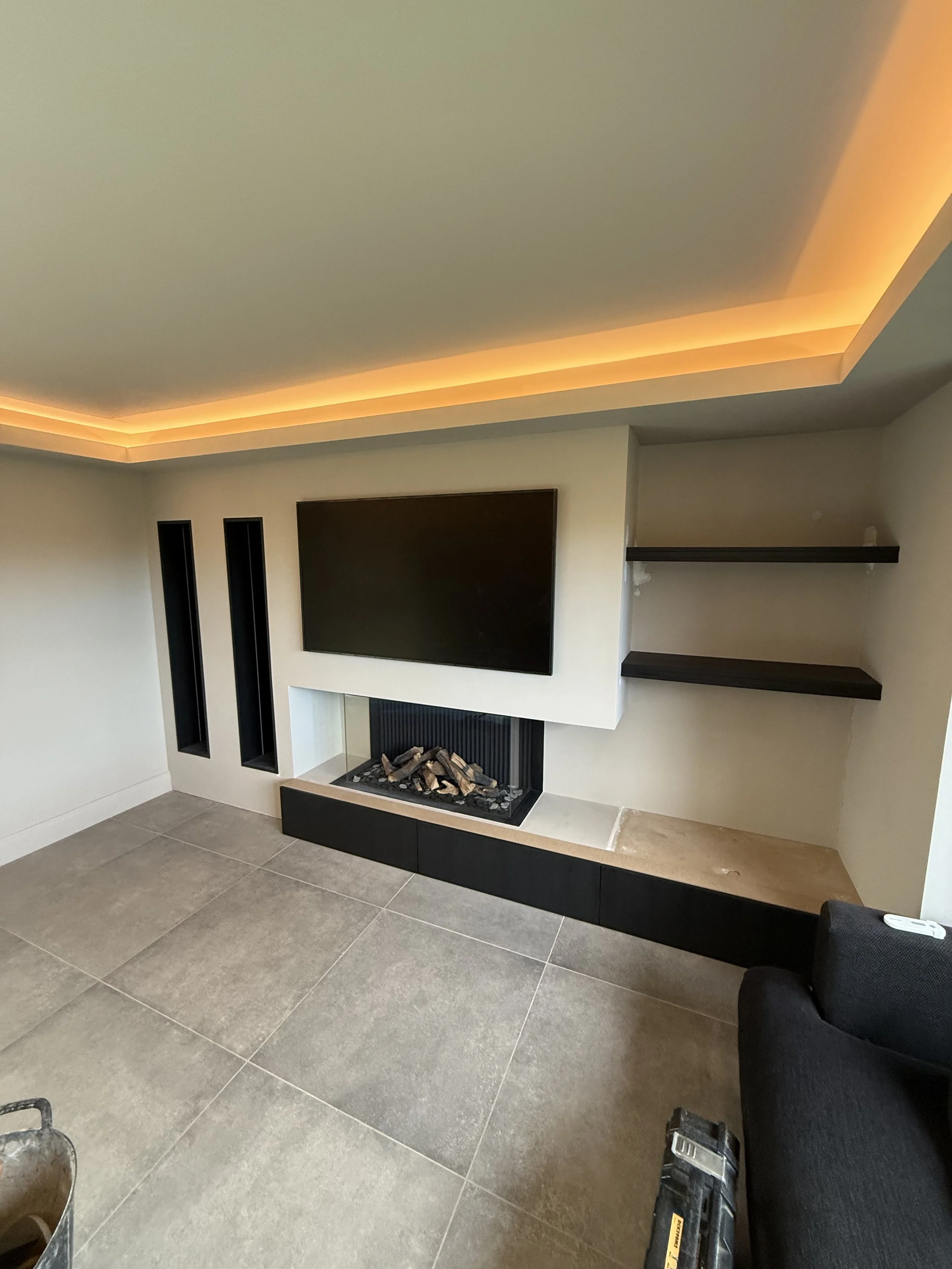 Modern living room fireplace with wooden paneling, under construction with tools and materials on the floor.