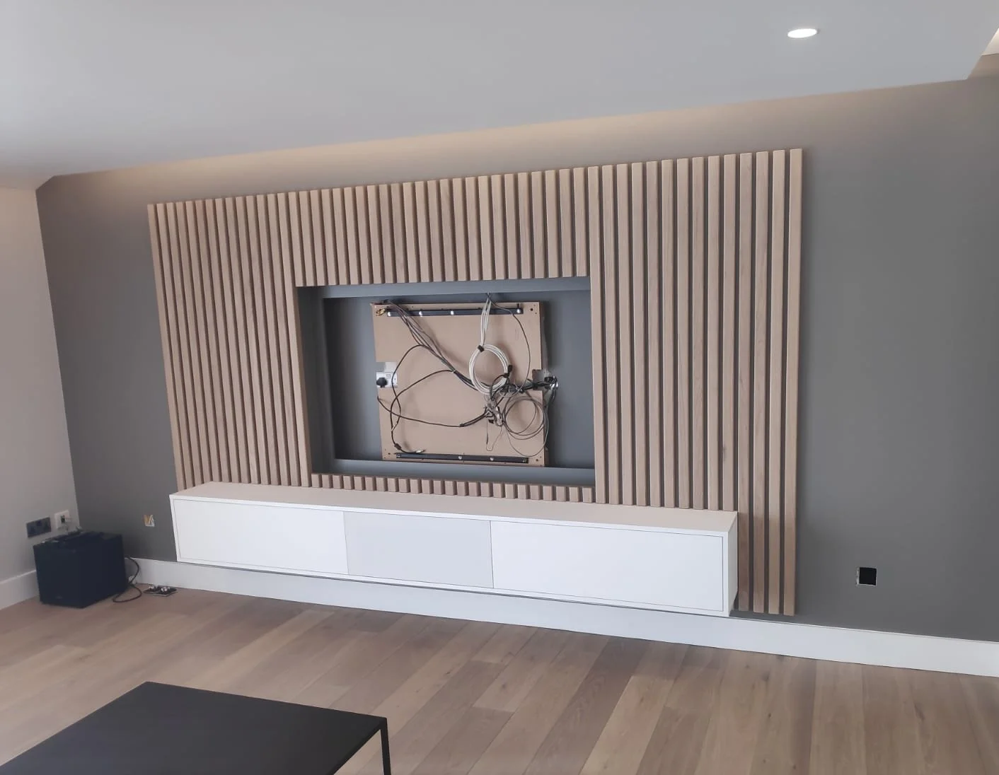 Interior of a room under renovation with a wooden slat wall paneling, a built-in entertainment center with exposed wires, gray walls, and light wooden flooring.