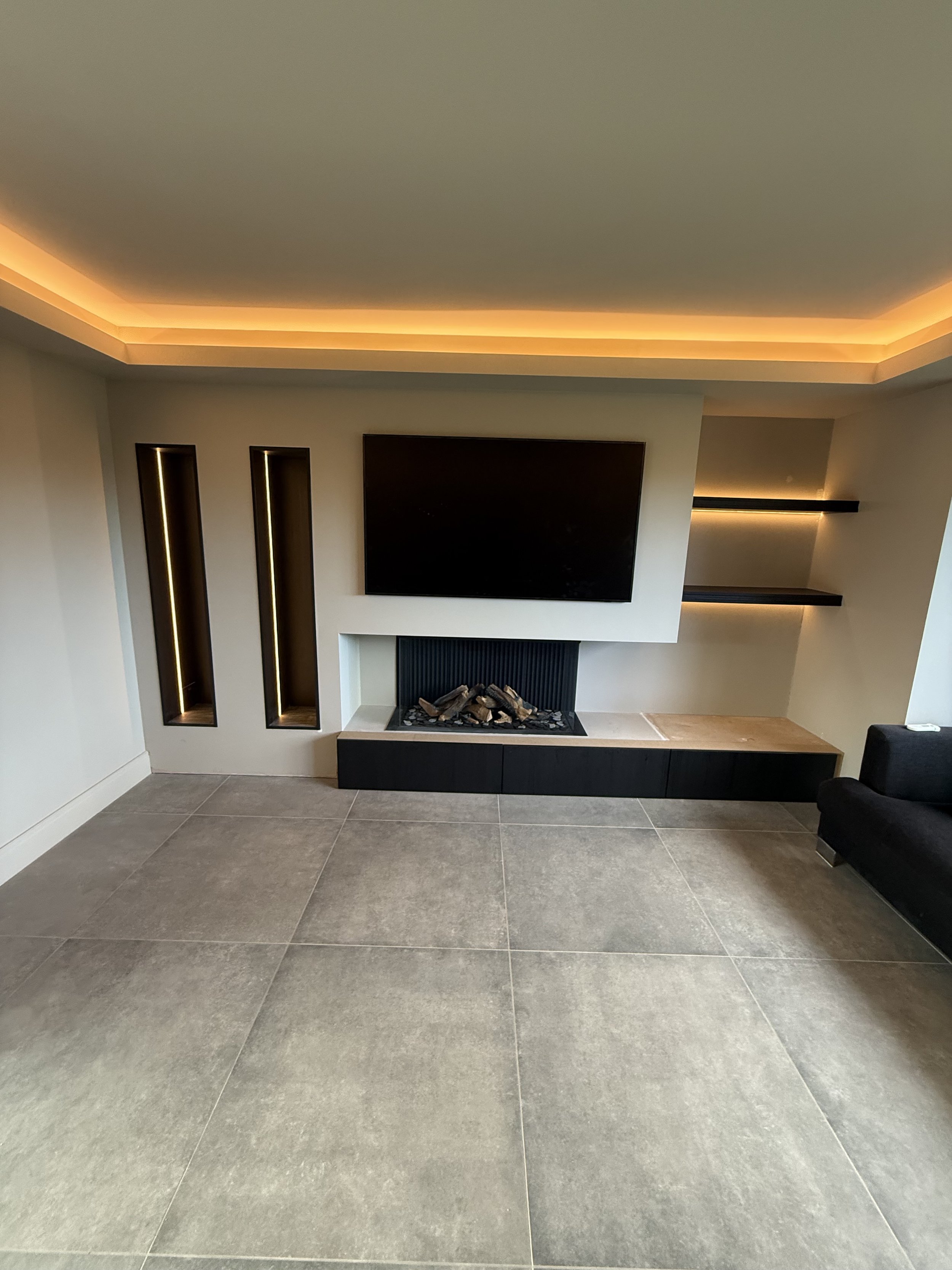 Living room wall with mounted flat-screen TV, dark wooden paneling, white open shelving unit below the TV, LED strip lighting around the wall, and some construction tools and insulation on the floor.
